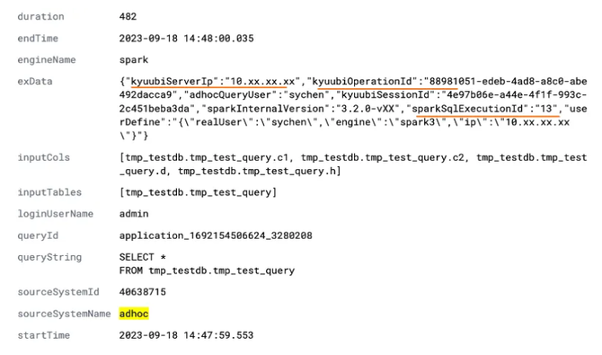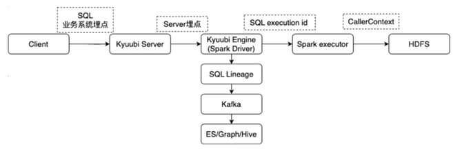 在 SQL Lineage 层面,基于 spark.sql.queryExecutionListeners 的 API 实现,采集了 Kyuubi Server/Engine IP,Session Id,Operation Id 和当前的 Spark 的 YARN Application Id,SQL 执行的 Id。