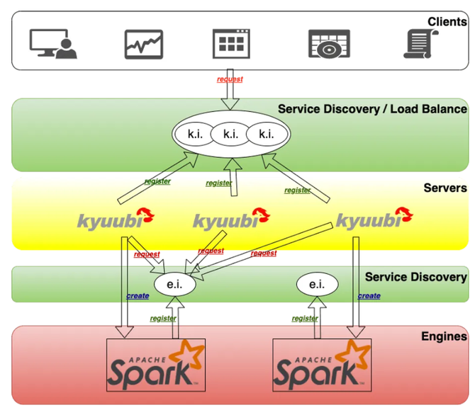 Server 层和 Engine 层都有一个服务发现层,Kyuubi Server 层的服务发现层用于随机选择一个 Kyuubi Server,Kyuubi Server 对于所有用户来共享的。