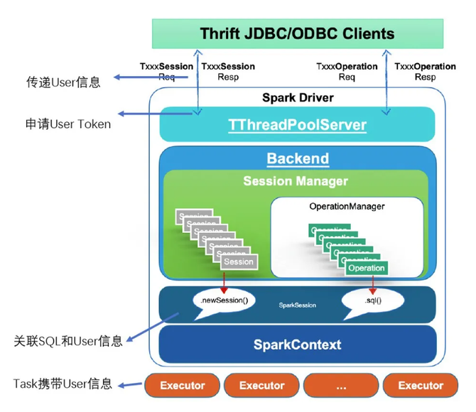 实现多租户的功能,是在 Client 发起 openSession 时,Server 在 SparkSQLSessionManager.openSession 对当前的 Session User 申请 HDFS DelegationTokens 和 Hive DelegationTokens。这一块 Token 传递和刷新和 Spark2 Streaming 更新 Token 逻辑类似。