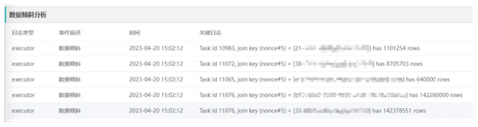接着在诊断平台的 Event log parser 实现相应的解析,提取 Join key 和行数,当用户诊断作业的时候,可以显示是否存在倾斜 Key 和倾斜行数。