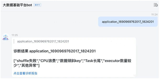 诊断平台是基于罗盘 (compass) 开源二次开发,集成在 Spark History UI 和企业 IM 的诊断机器人,用户可以自助诊断,输入调度系统的作业 Id 或者 App Id,Bot 即可生成诊断报告。
