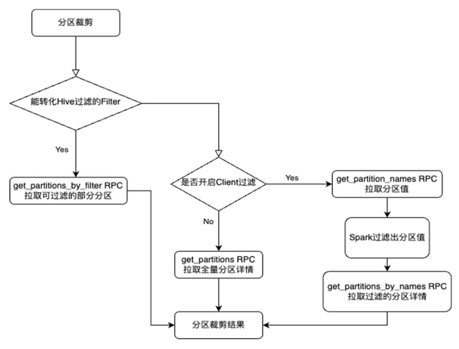 分析 Spark 关于分区裁剪的调用链路,Spark 先是把支持的算子转换成 Hive 支持过滤的 Filter SQL,如果支持转换,就直接使用 get_partitions_by_filter RPC 获取分区详情。如果不支持转换,则使用 get_partitions RPC 获取所有分区详情,再通过 Spark 的算子进行分区值的过滤,调用代价太高。