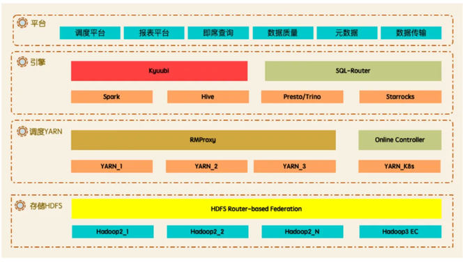 在 2022-2023 年持续演进过程中,数据平台 2.0 整体架构如下图所示。存储层支持多机房架构, 热/温/冷三分层数据,透明迁移,并且具备读取缓存,透明加速的能力。调度层支持灵活的优先级调度,NodeManager 节点混部,离线和在线节点混部,还引入了 Celeborn 作为新的 Shuffle service。引擎层从 Spark2 升级到 Spark3,使用 Kyuubi 作为 Spark 的查询入口。