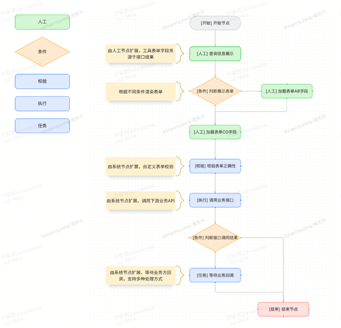 在流程标准化方面,星汉系统的流程引擎相较于目前主流的工作流引擎设计(如Activiti、Flowable、Compileflow、Turbo 等),更加轻量级且贴合业务需求。我们借鉴了BPMN2.0协议(业务流程建模与标注)的以及 Flowable 设计理念,但进行了简化和拆分,使之更加适应实际业务场景和操作。