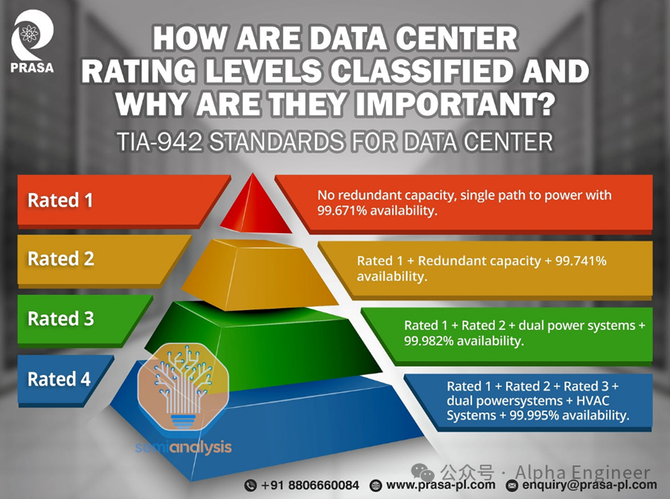 根据Uptime Institute以及ANSI/TIA-942标准,可以将数据中心按“预期停机时间”和“冗余度”进行分层评估,如下图所示。