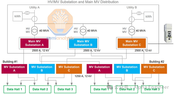 电力公司一般提供的是高压电力(>100 kV),因此需要使用on-site变电站和变压器来将其降低至中压(MV)。