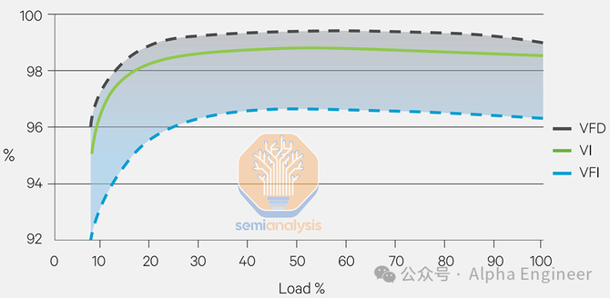 UPS 通常会带来3-5%的损耗,当负载较低时损耗会进一步加剧。现代设备可以通过待机模式(VFD)或者通过绕过 AC-DC-AC 的转换,将效率提高到 99% 以上,但这会使转换时间增加几毫秒 (ms),并带来短暂断电的风险。