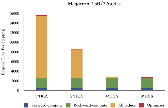 2张存储网卡采用的是25Gb/s的网卡,通过PCIe直连CPU,主要有2个用途,第一个是带内管理,如ssh登录、监控采集等,第二个是访问分布式存储,如读取训练数据、写Checkpoint等。大语言模型训练过程中,对于文本类数据读取量级要求并不高,且一般都会采用异步加载的方式,此时25Gb/s的网卡带宽可以满足需求。但是模型训练过程中保存checkPoint时,会有瞬时大量写流量,此时25Gb/s的网卡会成为瓶颈,阻塞训练的正常进行。为了平衡成本与性能的问题,我们内部采用了软硬件结合的方案,首先两张网卡采取bond4的网卡绑定方式,可以将整体带宽提高到50Gb/s,虽然牺牲了一定的容错能力,但是大大提高了网络的吞吐量。另外我们也在训练框架层做了2个方面的优化,第一个优化是通过分布式的方式存储checkpoint,将整个模型的checkpoint部分分别在不同的节点上保存以减少网卡的压力。第二个优化是多阶段异步保存,第一个阶段将模型与优化器从显存拷贝到内存,不阻塞模型的训练,第二个阶段将内存中的模型拷贝到分布式存储,其中第一个阶段结束后就可以继续训练了,第二个阶段可以在后台异步进行。软件层的优化主要是在基于网卡受限的场景下,通过减少checkpoint保存时间最大化GPU有效训练时长,最后经过验证,智脑7B的模型保存时间从最开始的383s降低到5s,性能提升约70倍。