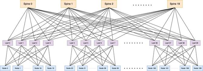 当前的网络架构上限是200台A800主机,如果此时想要支持更多的GPU,需要将2层的架构升级为3层,即在Spine层之上再增加一层 Core Compute Switch,来支持更大规模的GPU集群。