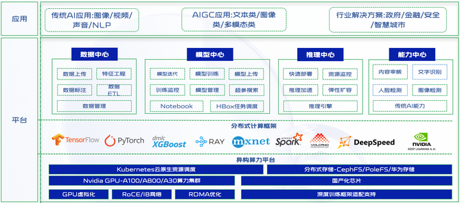异构算力调度:我们实现了在单一智算集群中构建NVIDIA-GPU和多种国产化芯片,兼容昇腾等主流AI芯片,并且全面适配支持了X86、arm架构,通过配套的AI开发平台一键调度海量异构算力资源。