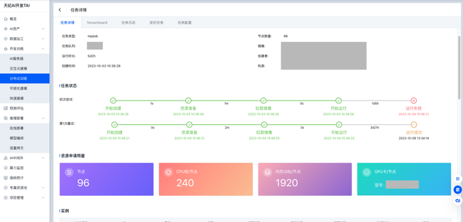 任务维度指标统计:任务维度的指标统计功能帮助用户深入了解每个任务的执行性能,主要包括:任务运行时长分析、任务执行成功率、TFLOPS统计、Token处理速度等业务相关指标,并支持根据这些指标进行任务成本评估和优化。