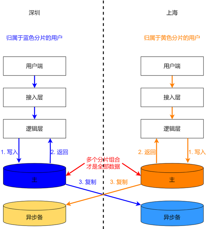 不做同步复制,首先要做的就是将数据根据地理位置做分片,异地多活不能接受延时的情况下,不同业务的分片规则可能会有差异,例如某多、某东、某宝的电商业务,和饿某某和某团的外卖业务的分片规则肯定是不同的,但基本上都是基于用户地理位置来做的:让离哪个城市近的用户数据尽量放到对应城市去。如下图所示,针对用户做了就近分片后,数据写入不需要做跨城同步复制,写入主写点后,直接对外返回成功,而不需要等数据同步到异地。