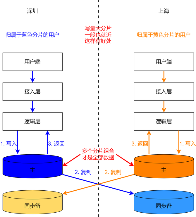 就近分片数据,数据需分片,由于业务不能接受跨城串行写入的耗时,只能做同城的同步复制,跨城则采用异步复制;