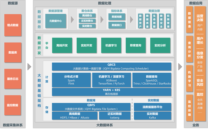 爱奇艺大数据体系构建在 Hadoop、Spark、Flink等开源大数据生态之上,提供了数据采集、数据湖、实时与离线计算、机器学习、数据分析等多种基础服务,并自研了日志服务中心、大数据开发平台、机器学习平台、实时分析平台等一系列大数据相关平台,打通数据采集、数据处理、数据分析、数据应用等整个数据流程,提升数据的流通效率。