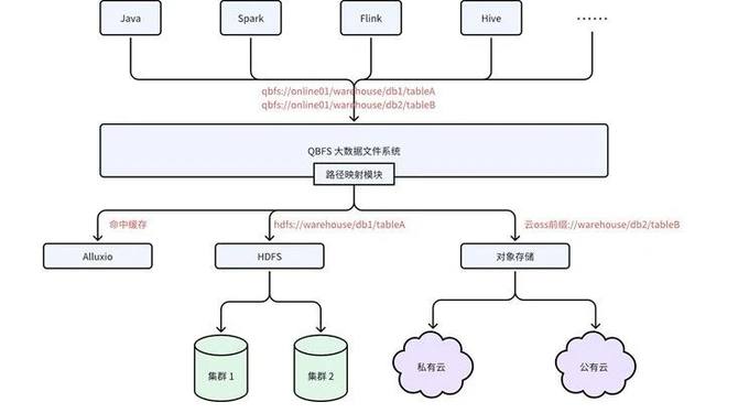 QBFS 实现了存储路径的统一命名空间,例如qbfs://online01/warehouse/db1/tableX,路径中的online01为 Region 标识,同一个Region 下的不同路径(比如 db1、db2)可能分属于不同 AZ、不同集群、不同类型的文件系统(比如 HDFS 或对象存储)。上层计算引擎只需使用 QBFS 路径,而无需关心底层的存储细节,由 QBFS 通过虚拟路径与底层存储的映射关系进行路由。计算任务可以在任何集群上访问 QBFS 中任何集群的数据,从而实现了真正的存储计算分离。