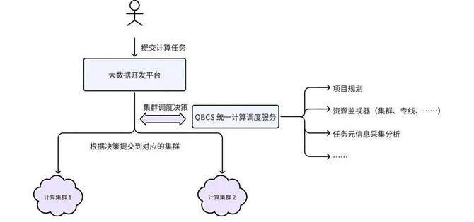 根据统一计算调度的架构,用户通过大数据开发平台提交计算任务,无需指定具体的运行集群。工作流平台在运行任务之前,请求 QBCS 服务,获取该任务本次运行的集群。QBCS 调度模块将根据任务信息,获取决策调度的相关因子,然后结合各因子的权重,计算出最合适的调度集群。