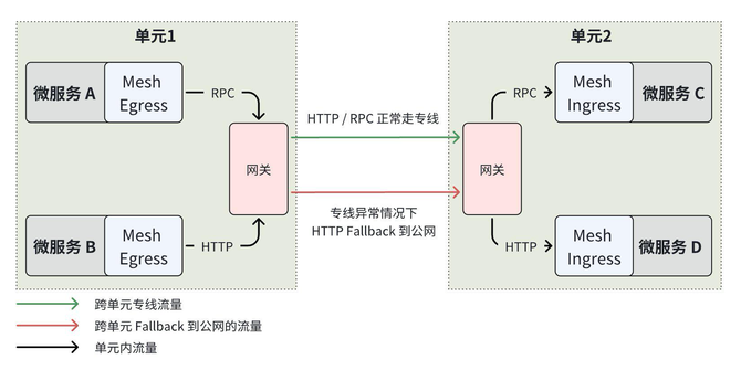 跨单元 RPC 通道收敛:在单元化流量路由场景,某个流量很大的 RPC 服务可能仅小比例命中跨单元纠偏,此时由于下游实例数量很多可能导致连接复用效果较差。此时如果让所有跨单元 RPC 先统一经过本地边界网关,然后传输到其他单元的边界网关,最后再转发给实际下游,则建连过程拆分成了 3 段,中间段(网关之间)被所有跨单元 RPC 共用,可以保持较高的链接复用率; 另外 2 段为本地建连,即使连接复用率低,带来的耗时增加也较少。此外收敛到网关通道也更容易集中对跨单元 RPC 进行其他优化,比如按接口等级进行 QoS 管控、在专线完全故障情况下对重要的控制信令做加密后 Fallback 到公网传输等: