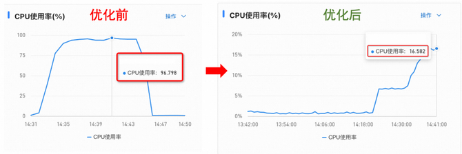 由于计算资源消耗的下降,同QPS下的平均RT也大幅下降。此外我们发现,优化前,随着QPS不断提升,RT明显变慢、变慢幅度很大,优化后,RT变慢的幅度明显减缓。这意味着,系统容量也更加深不可测了。