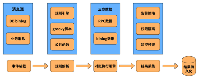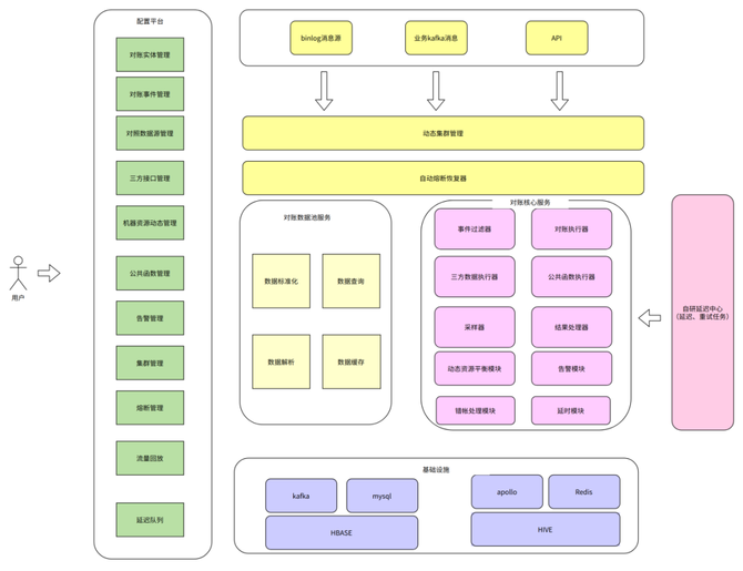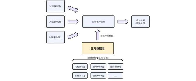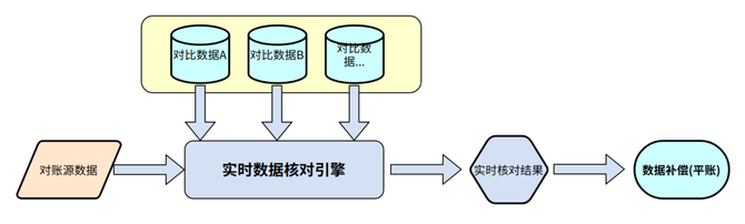 根据对以上问题的分析,凡资损问题一定伴随着数据的“错”与“乱”,因此我们从数据本源入手,将实时源数据与对比数据进行核对,或者逻辑处理,判定源数据的准确定与合理性。且在资金流转的各节点,各中间数据均可成为“源数据”,秉承凡数据皆可核对的理念进行实时对账系统的构建。