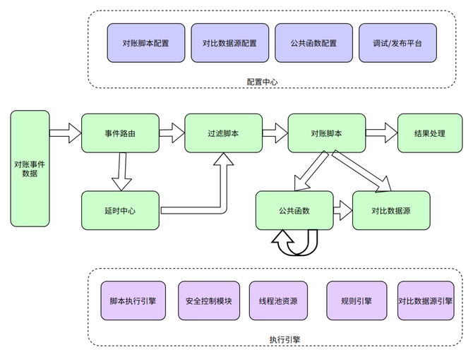 数据核对是实时对账的核心流程,事件数据经过配置解析,路由分发到对应的对账引擎与延时中心,经过过滤脚本过滤无效信息,最终流转到对账脚本执行引擎。执行引擎可以调用公共函数,三方数据源获取对比数据,最终按照脚本进行核对,核对结果流转到结果处理模块。