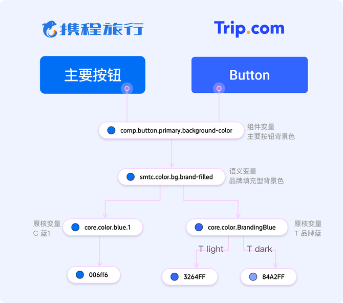 携程的设计系统采用模块化设计原则,将设计元素拆分为独立模块,实现品牌间的复用和独特性。通过灵活的主题配置,设计师可以快速调整品牌视觉风格,确保品牌形象一致。
