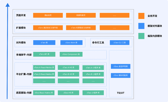 xTaro 跨端解决方案通过创建模块化、可扩展的模块架构(如下图所示),将功能模块划分为4层结构:对外模块、多端抹平、平台扩展和底层基础。实现方案如下:
