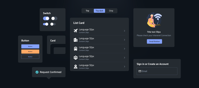 在实际业务场景中,应用程序需要具备灵活的界面切换能力,以满足多样化的用户需求。通过使用本方案的组件库,集成了多框架多品牌主题,实现了界面风格的灵活切换,如暗黑模式、Ctrip 和 Trip 品牌主题。