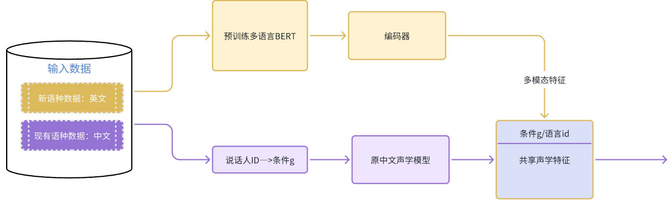 为支持多语种合成,采用迁移学习技术,通过共享声学特征将现有语言模型的知识迁移至新语种。