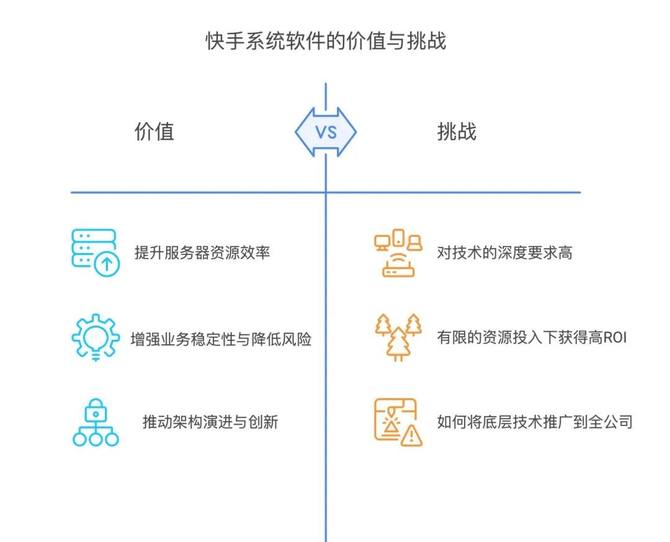 然而,随着规模的扩大,系统软件研发也面临着更为严格的挑战和约束条件。特别是在快手这样的背景下,挑战尤为突出。一方面,系统软件团队需要具备深厚的技术底蕴,不仅要深入到底层软件和硬件领域,还要理解上层平台以及业务逻辑,才能与业务团队保持同频共振。另一方面,与行业内的大型企业相比,快手在系统软件研发上的人力和物力投入相对有限。因此,快手需要更加精准地识别并解决公司面临的关键技术问题,在解决关键问题上做到极致,不追求大而全。同时,快手需要站在巨人肩膀上,基于巨人创新突破,避免重复造轮子。