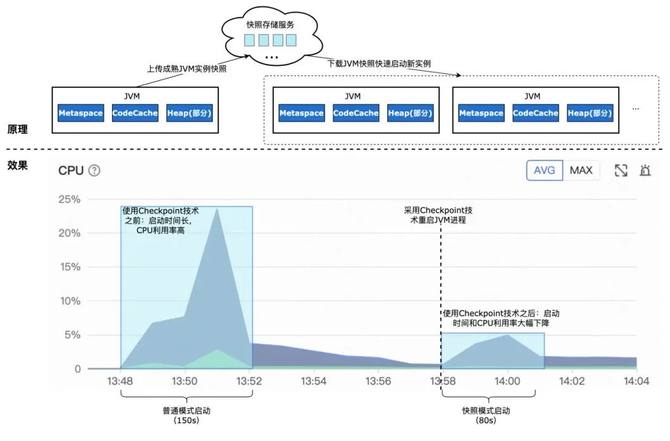 近期,我们在研发另一项有趣且极具挑战性的技术——JVM Checkpoint。这项技术能将JVM内部的CodeCache、Metaspace等数据快照保存到远程,下次JVM启动可以直接拉起快照,快速运行。从实际应用效果来看,在启用Checkpoint之前,启动时间需要150s,而启用后,启动时间大幅度缩减至80秒,启动速度提升了近一半。此外,启动阶段利用率能从23%降低到5%。这项技术将能大幅度提升应用启动速度,增加弹性能力,大幅减少回滚时间,也能节省启动阶段资源预留成本。值得一提的是,快手系统软件团队始终坚持做难而正确的事,我们提前1-2年进行技术规划和储备,以确保我们的技术始终走在行业的前沿。