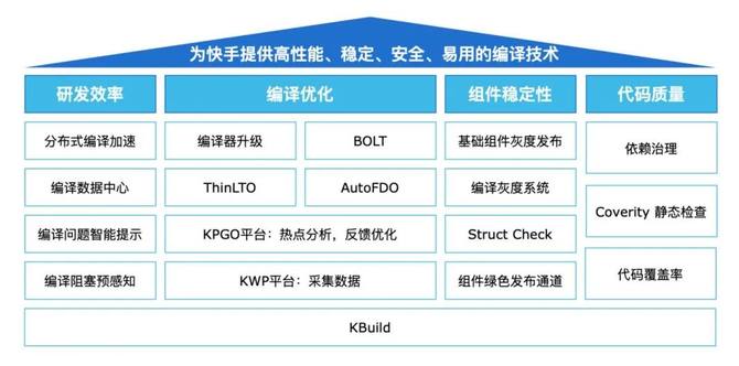 编译器领域的核心使命是为公司提供高性能、稳定、安全且易用的编译技术,其中快手的主要承载产品是KBuild。KBuild助力快手大部分业务编译构建,其价值体现在四方面:研发效率上,通过分布式和缓存技术,KBuild将C++工程编译时间从超1小时缩短至5分钟内,大幅提升团队效率;稳定性上,通过灰度发布控制基础组件,减少代码变更引发的稳定性问题;代码质量上,配备静态扫描机制,发现开发Review阶段难以察觉的问题。性能优化方面,通过编译优化技术降低服务器用量,优化延时提升用户体验。