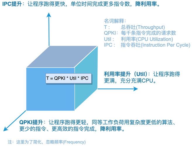 快手系统软件常用的CPU性能优化方法论如下,其核心目标是在确保符合SLO的前提上,最大化提升单机吞吐能力(对于在线服务而言,通常体现为QPS的提升)。这一优化过程在三个维度发力:利用率提升让程序跑得更满,比如前面提到的协程和在离线混部就是这个维度;在IPC提升维度,比如前面提到的通过微架构优化能提升IPC;另外复杂度降低维度,比如业务做的简化架构、请求合并、无用逻辑删除等等都是这个维度。