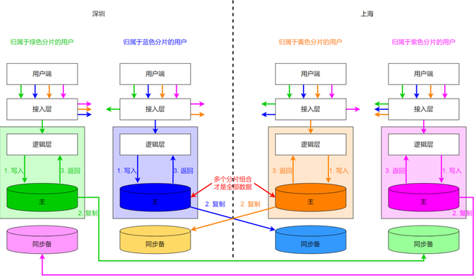 就近分片数据,数据需分片,由于业务不能接受跨城串行写入的耗时,只能做同城的同步复制,跨城则采用异步复制;