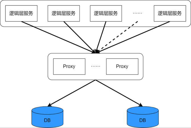 数据层是业务的根本,虽然通过分片、副本、缓存等操作,将落到 DB 的请求量减少到可接受的地步,但是逻辑层作为数据层的调用方,还是不可避免的需要建立和数据层 DB 的连接,如果逻辑层的调用方过多,则会需要和 DB 构建更多的连接数。增加连接数能够增加 DB 的并发度,支持更多的调用方,提升吞吐量。但是,数据库的性能并不是可以无限扩展的,当达到一个阈值以后,由于高并发导致的资源抢占、线程上下文切换,反而会导致数据库的整体性能下降。比较普遍的做法,是为数据层 DB 添加一层代理,避免逻辑层调用方直连 DB,由代理来收拢和 DB 之间的连接。