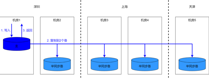 三地三中心,可以形成最小的多数派,也能满足容灾需要,不过考虑到下面几点,一般都没有采纳: