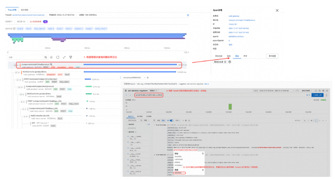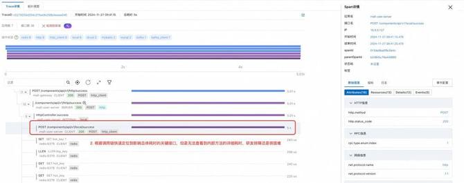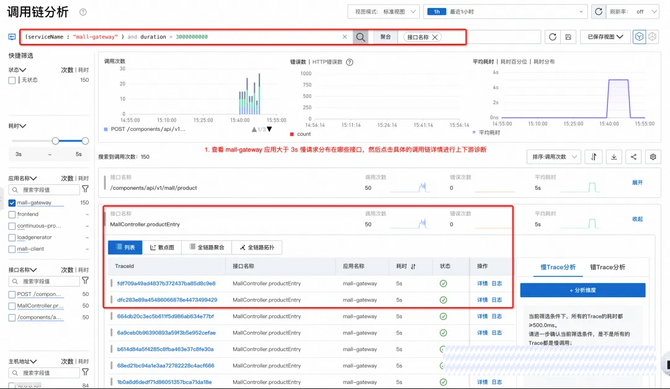 2. 根据调用链瀑布图定位到影响总体耗时的关键服务接口,完成问题初步定界。