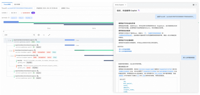 目前阿里云 ARMS 已经基于 LLM 大模型实现了单链路智能诊断,综合调用链、方法栈、异常堆栈、SQL、指标等多模态数据,结合链路诊断领域专家经验,有效识别单次请求的错慢根因,并给出相应的优化建议。