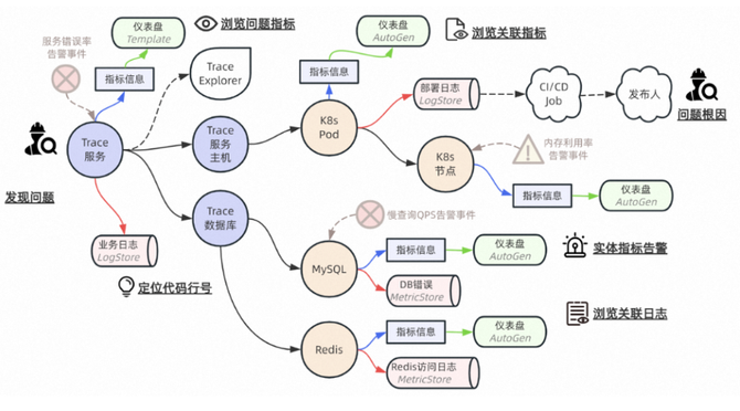 无论是“错”问题,还是“慢”问题。从研发运维视角,都希望能够快速止损、定位根因、消除隐患。然而,面对复杂的应用间依赖,如何抽丝剥茧快速定位异常节点,深入分析异常背后的根本原因,并在极短的时间完成定位与恢复动作,每一步都面临巨大的技术挑战。