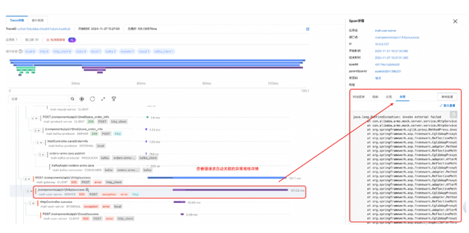 2. 链路关联异常堆栈:以 Java 应用为例,系统报错通常会抛出特定异常(包含详细的错误原因与调用堆栈),通过 TraceId 准确关联当次请求的异常堆栈,可以加速研发排障效率。