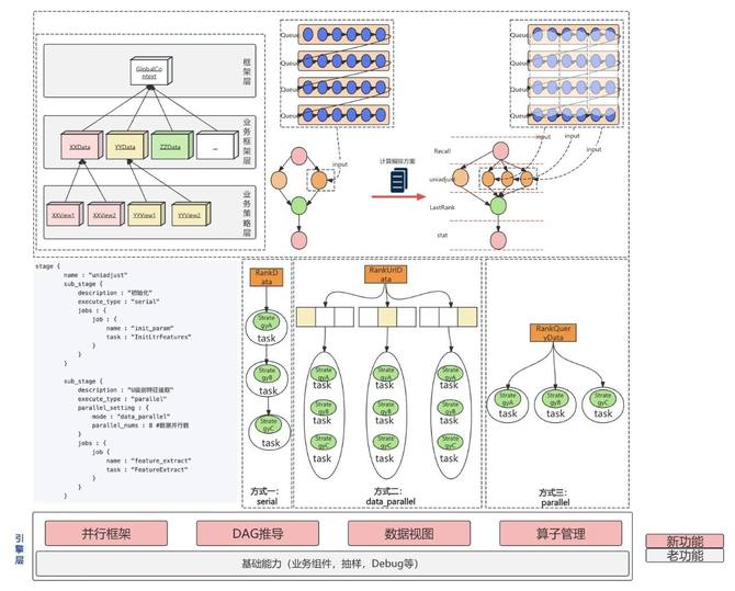 对上述问题和挑战,我们采取了一系列综合措施来加以解决。首先,为了解决架构耦合与复杂性问题,我们对核心排序模块进行了深度重构,将原本集成在其中的召回处理与摘要计算功能独立出来,从而实现系统分层的合理化。其次,采用支持串行、并行和数据并行的灵活框架,提升视频排序流程的可视化管理和并行计算能力,并基于弹性算力分配控制中心,高效利用系统空闲资源,最大化搜索视频业务收益。最后,在大模型端到端排序模式下,推动多阶段级联框架向单阶段端到端框架转变升级。下面详细介绍以上解决方案的设计思想: