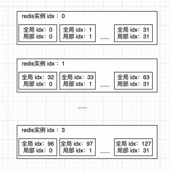 以图3.2为例,图中共有4个32分片redis实例,每个实例都有实例idx,每个分片都有局部分片idx和全局分片idx,那么可以通过下列方式计算实例和分片信息。