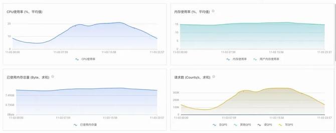目前交通链路各个环节MQ升级为Redis Stream已经基本完成,已持续稳定运行一段时间,并取得了显著的成本收益和时延收益,相较于MQ,成本和时延均下降90%+。以某一环节为例,该环节高峰期间消息量级约2000w/min,平均消息大小1k,使用4个 64G 64分片 redis实例,集群日常水位如下: