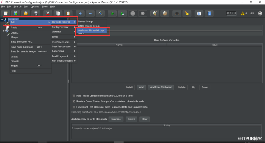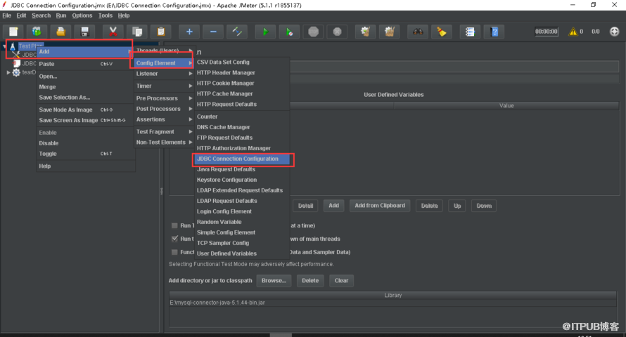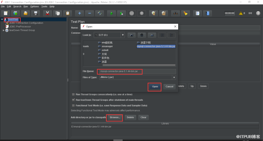 下 载后,分别都解压开来,打开Jmeter ( 在bin目录下有个jmeter.bat,双击它前,你的机器需要先安装JAVA8,只有这样才可以运行 ) ,在测试计划中,导入JDBC的jar包