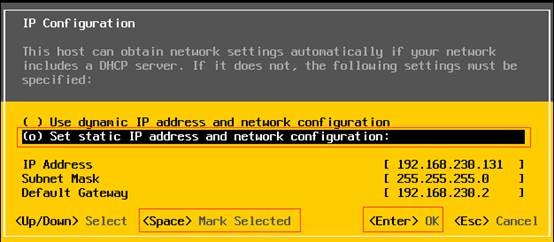 选择静态地址,使用空格键进行标记,录入IP地址,掩码及网关,然后回车确认。