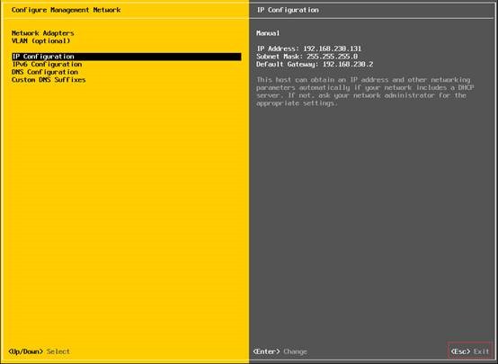 使用方向键选择“Configure Management Network”,回车进入网络管理页面。