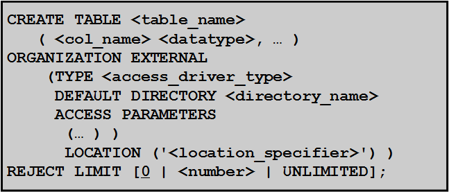 (7)Which mandatory clause has to be added to the following statement to successfully create an external table called EMPDET;CREATE TABLE empdet (empno CHAR(2), ename CHAR(5), deptno NUMBER(4)) ORGANIZATION EXTERNAL (LOCATION ('emp.dat'));