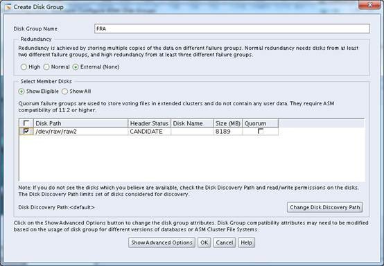 使用grid用户执行asmca,创建名为FRA和DATA的ASM磁盘组