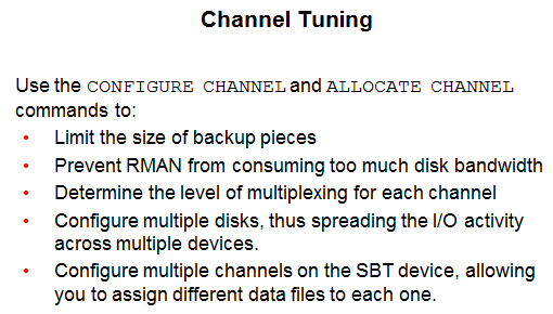 如果备份到磁盘,并行通道数等于磁盘子系统的数量时会达到最佳的性能,磁盘子系统数量指的是输出设备跨几块磁盘。例如磁盘子系统分布在3块物理硬盘上,则应分配3个通道。