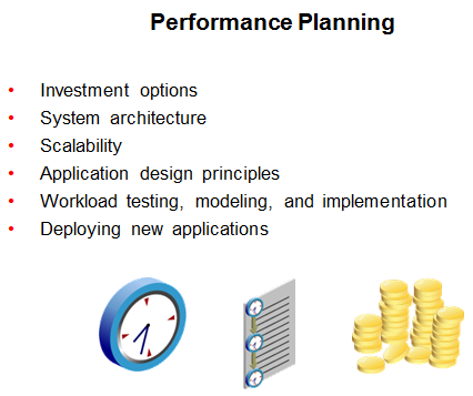 性能计划涉及到很多方面。计划必须包括在性能(速度),成本和可靠性之间的平衡。必须考虑系统架构的成本:满足需求的硬件和软件基础设施。需要对给定的环境,应用程序和性能要求进行分析。例如,硬盘和控制器的数量对数据访问速度的影响。