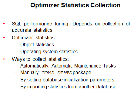 优化程序统计数据是数据库对象的特定信息的集合。这些统计数据对于查询优化程序为每个SQL语句选择最佳执行计划是必不可少的。定期收集统计数据,收集间隔期间统计数据不会改变。